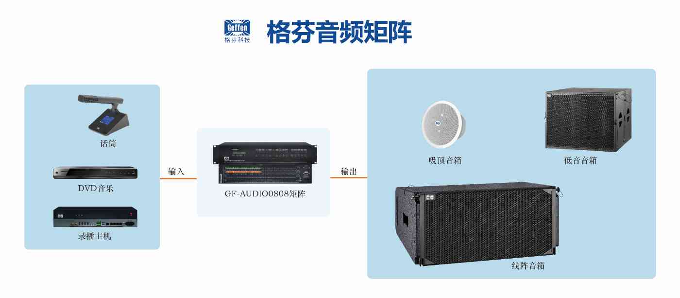 GF-AUDIO0808P音频处理器,还具有高兼容性、控制灵活、操作简单等功能特点,可灵活应用于中、大型网络音频系统,如指挥中心、星级酒店、会议中心、公交枢纽等。