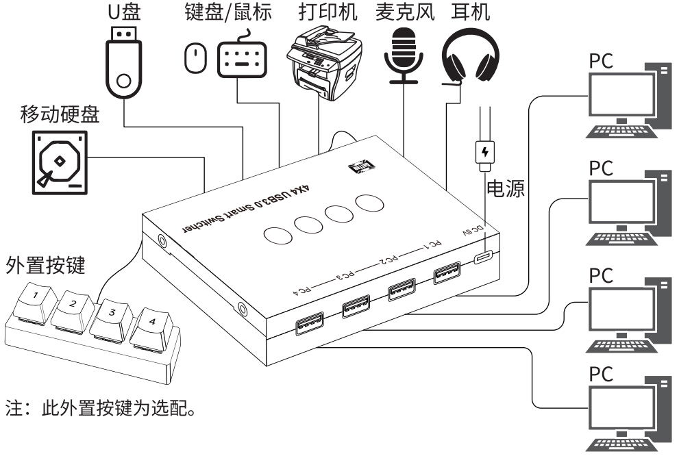 4X4 USB3.0共享器可以实现4台电脑共享四个USB3.0接口的设备,如打印机、键盘、鼠标、多功能一体机等USB3.0的外接设备。可以通过共享器达到多台电脑共享四个设备的目的,附带USB声卡功能,支持耳麦输出音频,并支持RS232通讯控制切换通道。即插即用,高兼容性,无需额外的驱动程序即可开始使用。可广泛应用于娱乐游戏、证券场所、视频会议、多媒体教学、安全中心、数据控制中心、信息分配等环境,让办公、娱乐更畅快。