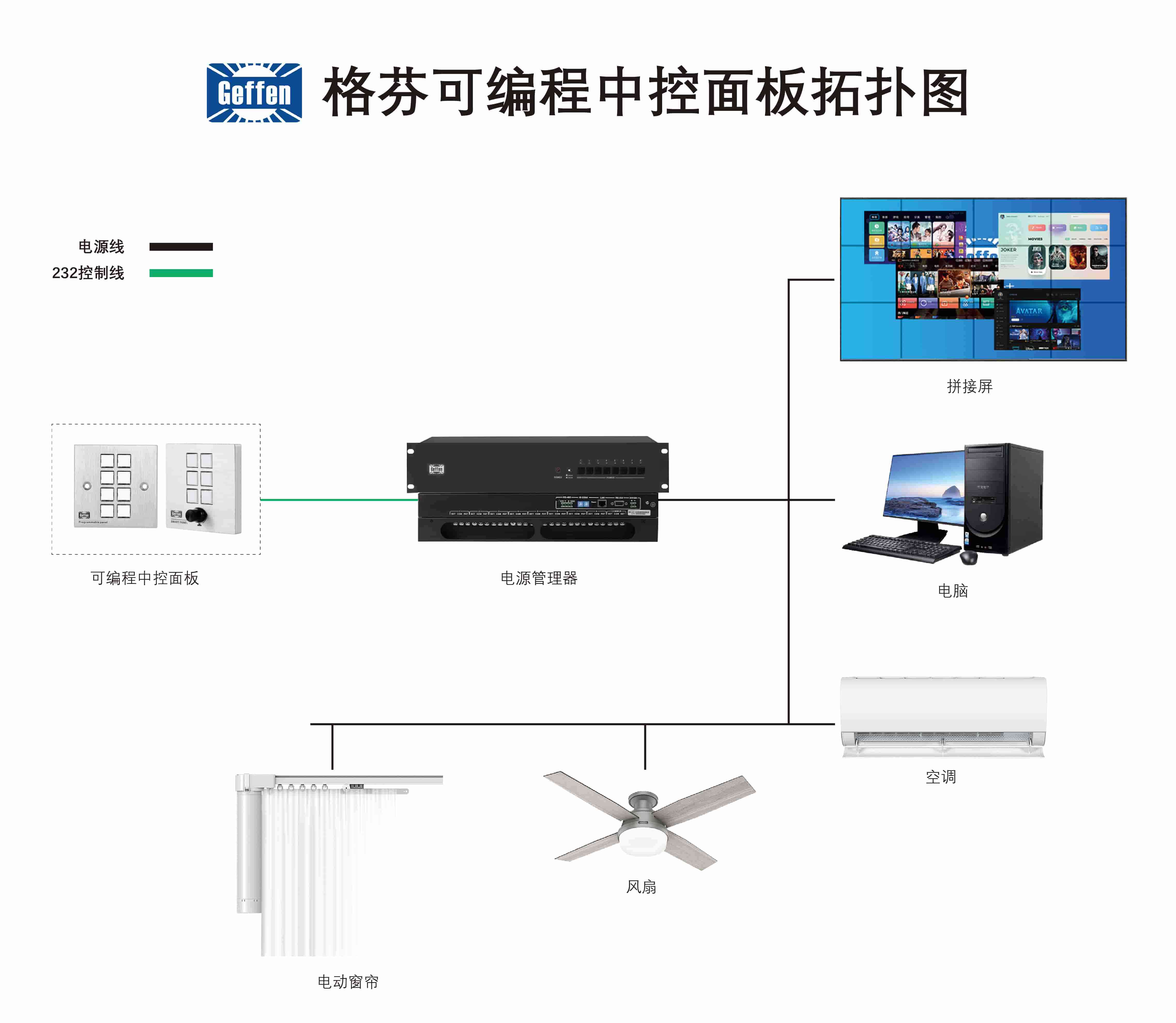 GEFFEN 中控系列GF-PR8,该款可编程按键控制面板,具有8个可调光LED水晶按键,每个按键都可以按工程的实际情况进行编程设置,同时各按键之间可以相互影响也可独立使用。它接口丰富: RS232端口3路、 RS485端口1路、红外发射端口3个、继电器控制端口2路,方便控制各种设备。它简易实用、安全可靠控制方式,是您在会议室、展示厅、教室、多媒体教室等工程项目中的好帮手。