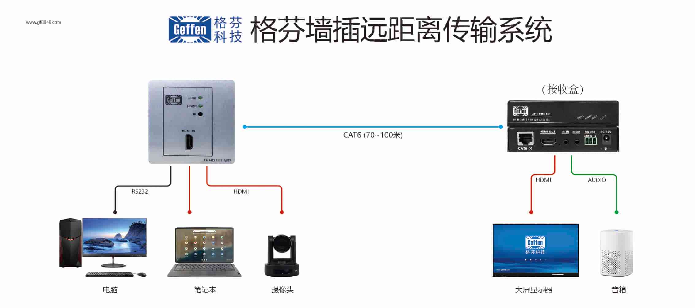 通过Cat6双绞线,可实现长达70~100米的信号传输,远远优于目前的HDMI、VGA、Display-Port标准,是较远距离传输上的不二选择。常见如投影机、电视、混合矩阵、高清播放器等。支持POC/POE功能。, 设有HDMI输入接口,将接收的HDMI信号转换为HDBaseT格式,并通过RJ45接口输出。同时GEFFEN格芬科技GF-TPHD桌插/插墙/地插系列还支持红外输入和RS232输入,可同时将IR信号以及RS232信号与HDBaseT信号一同输出给接收端。