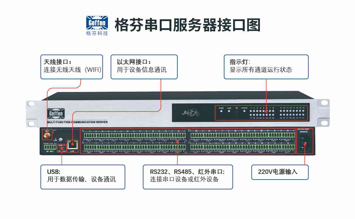 GF-MCS16串口服务器是一款将传统串口设备(如RS-232/RS-485/红外)无缝接入以太网的智能设备,通过串口转网络技术实现数据远程传输与集中管理。其核心功能包括多协议支持、双向透明传输、远程监控及工业级稳定性,适用于工业自动化、智能楼宇、物联网、电力监控、交通管理及医疗设备联网等场景。将门禁系统、空调控制器、照明系统等串口设备联网,实现楼宇智能化管理。产品凭借高效稳定的性能、灵活扩展的接口、安全可靠的数据加密以及工业级抗干扰设计,助力实现设备智能化升级,提升管理效率。