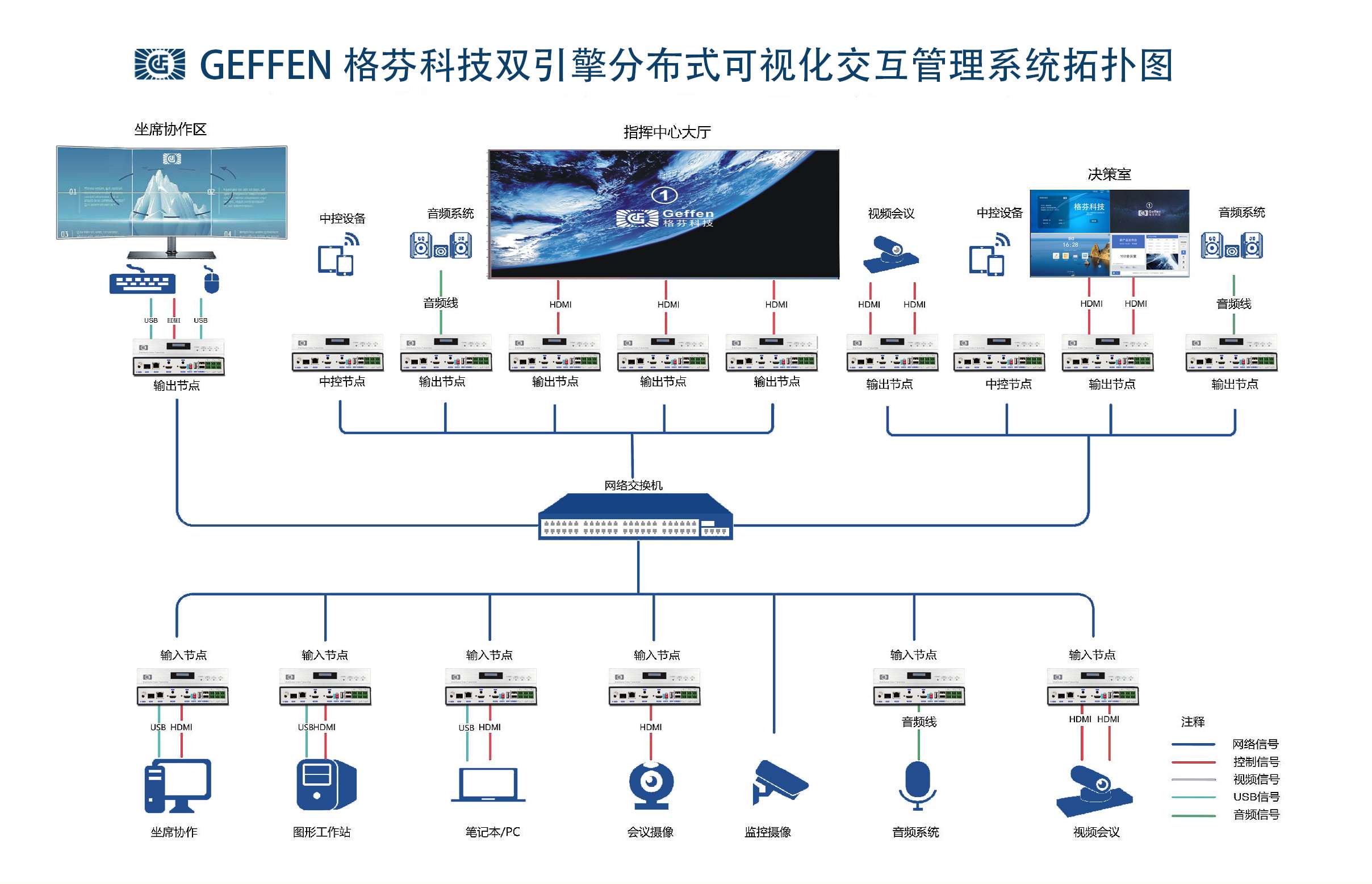 多媒体会议中心:实现视频会议、本地信号的无缝切换与拼接显示,满足会议演示需求。